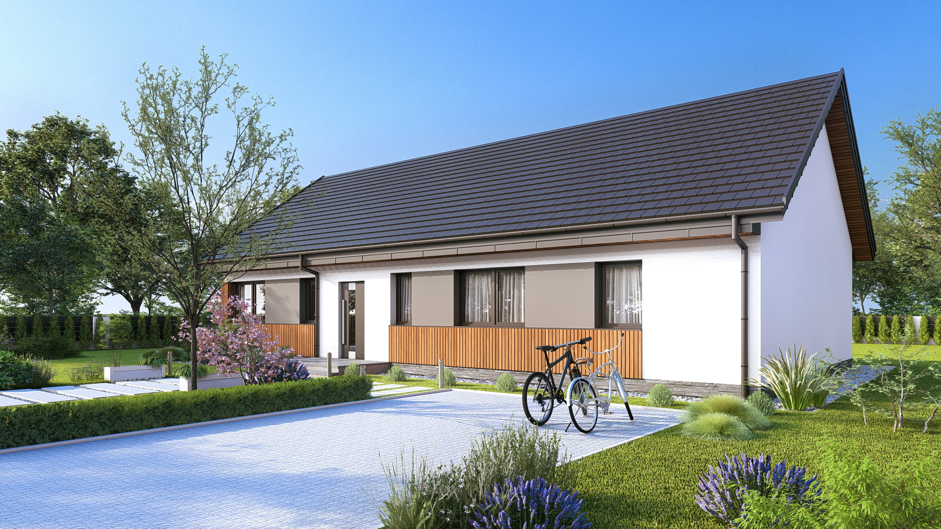 Nowoczesna elewacja utrzymana w neutralnej tonacji z drewnianymi wstawkami nadaje domowi elegancki, współczesny charakter. Całość zamyka klasyczny, dwuspadowy dach, który podkreśla prostotę i ponadczasowość formy.